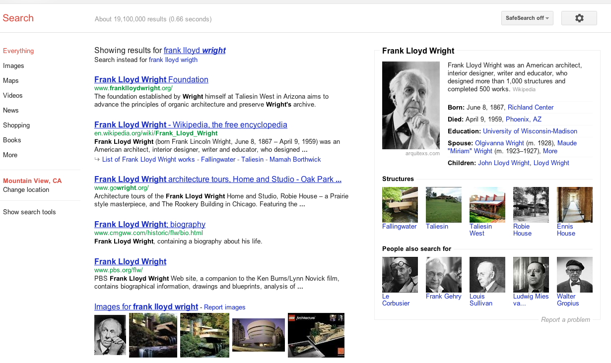 For instance, as this ABC News article explains, search for “Frank Lloyd Wright” today and the first link might be to Wikipedia. But now, to the right of that result you’ll see some of that Wikipedia or other sourced information right on the search page, including a short summary. You’ll also get related searches.The term graph is being used because it’s describing how Google is building relationships between people, places and things and reporting facts about these entities.