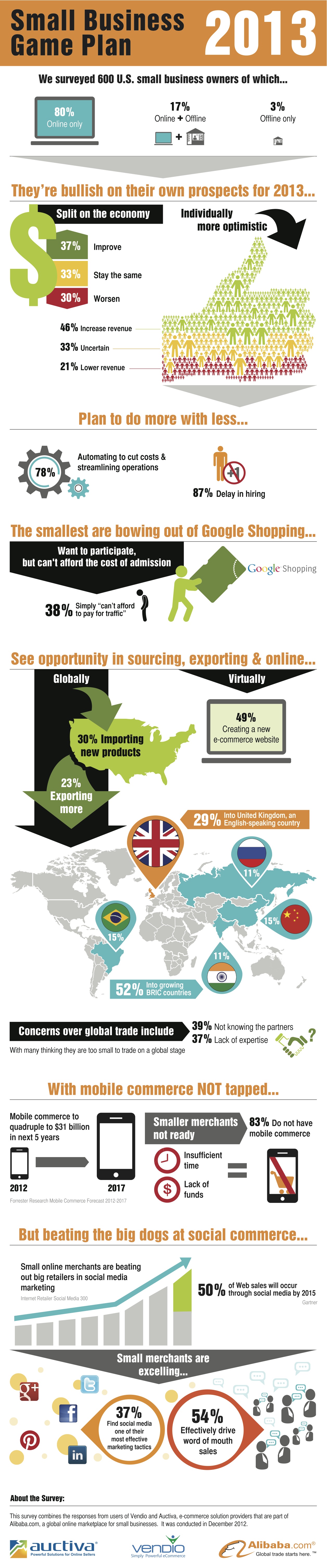 Alibaba.com, Vendio and Auctiva conducted a survey of 600 small businesses in December 2012 and found that 63% of respondents expect the economy to stay the same or worsen in 2013.